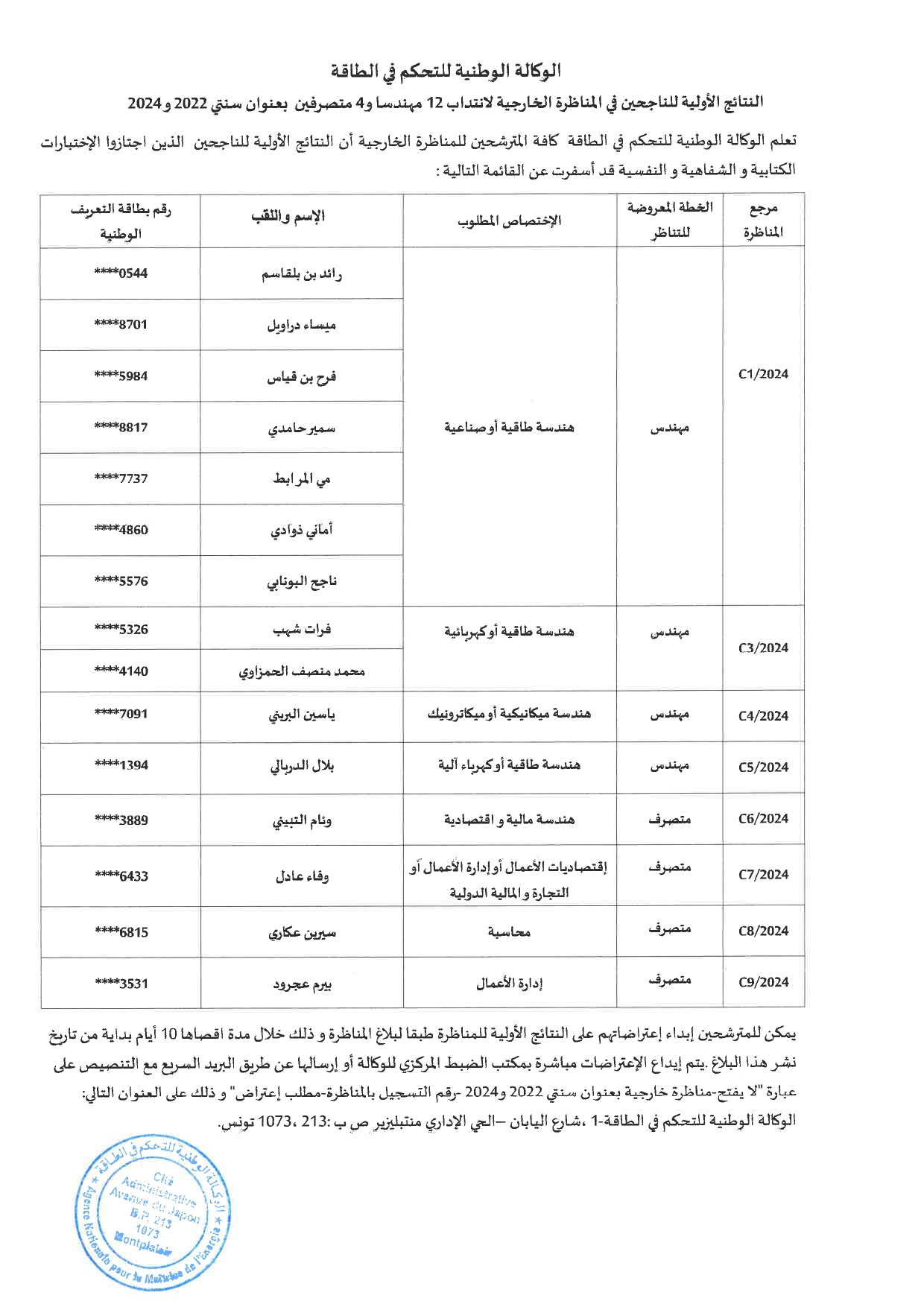 النتائج الأولية للناجحين في المناظرة الخارجية للوكالة الوطنية للتحكم في الطاقة لسنتي 2022 و2024
