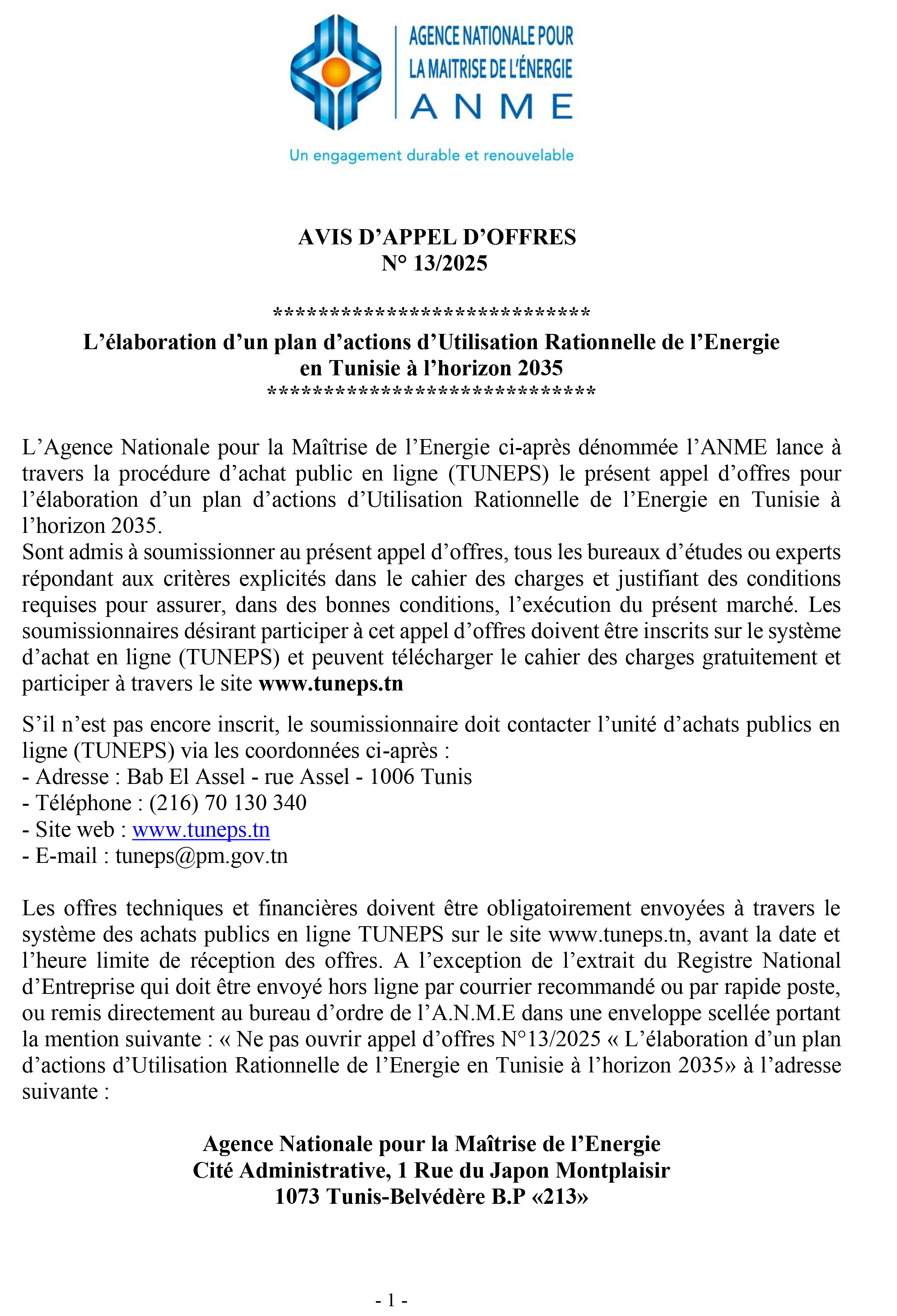 AVIS D’APPEL D’OFFRES N° 13/2025 : L’élaboration d’un plan d’actions d’Utilisation Rationnelle de l’Energie en Tunisie à l’horizon 2035