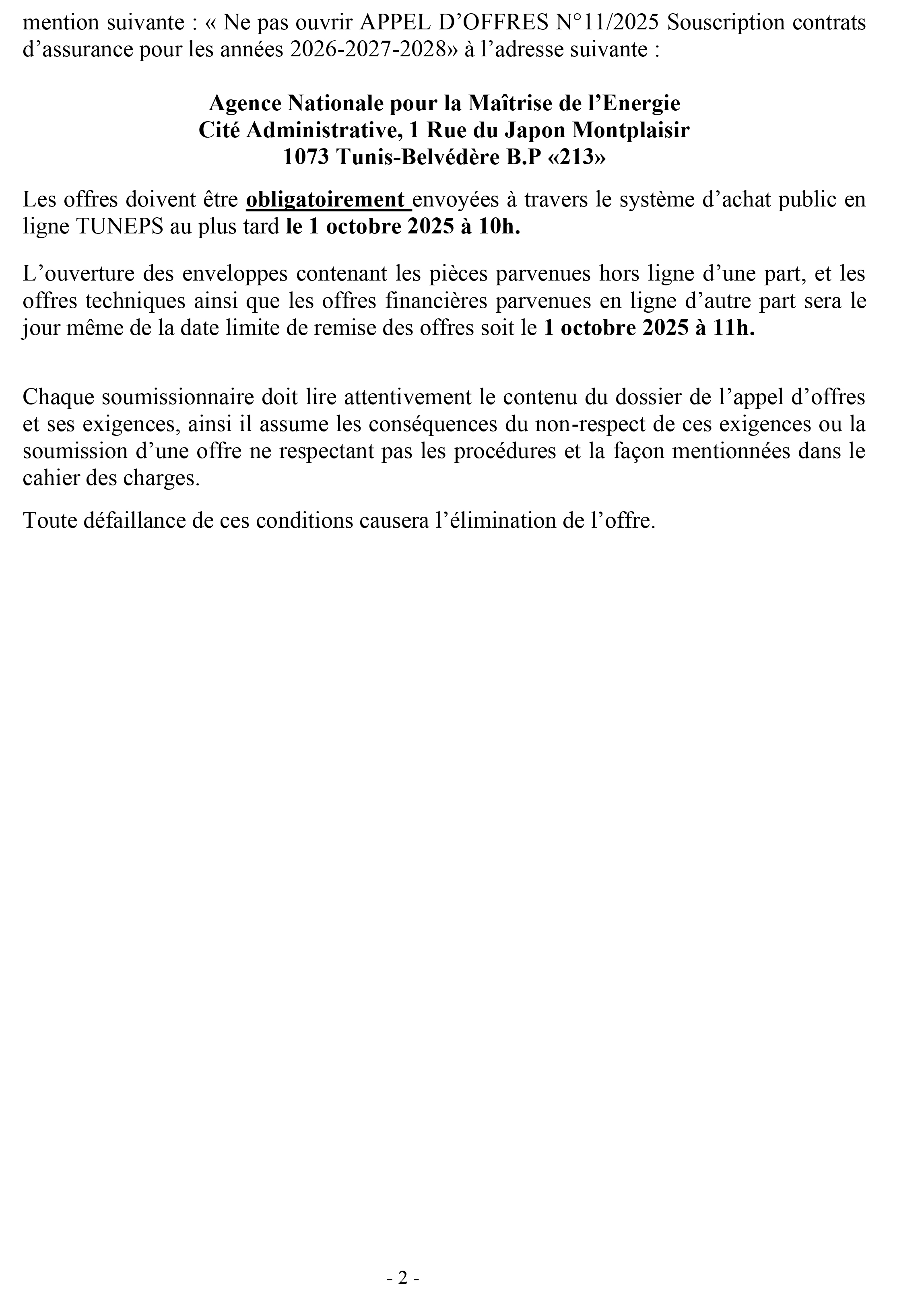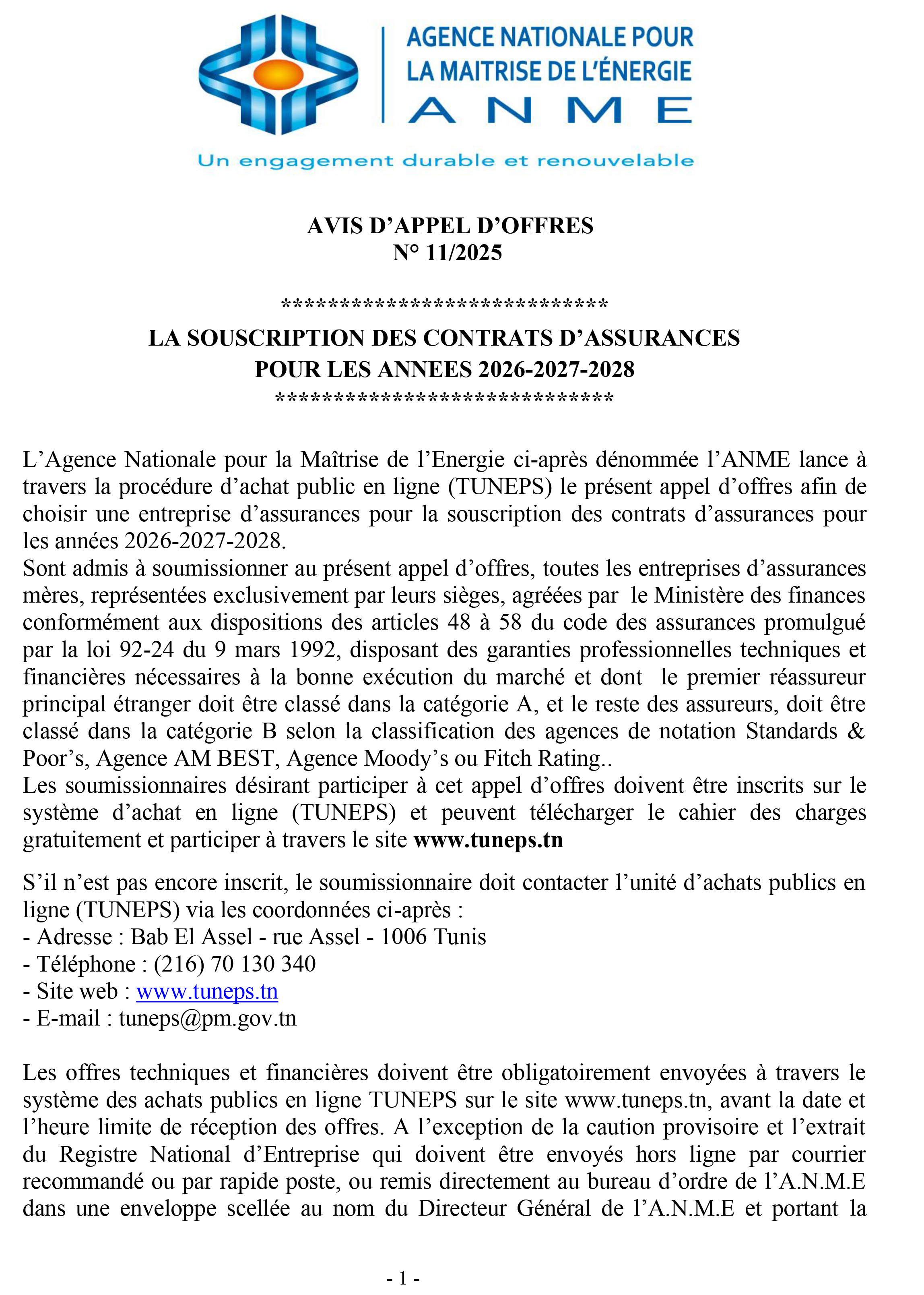 AVIS D’APPEL D’OFFRES N°11 - 2025 SOUSCRIPTION DES CONTRATS D’ASSURANCES POUR LES ANNEES 2026-2027-2028