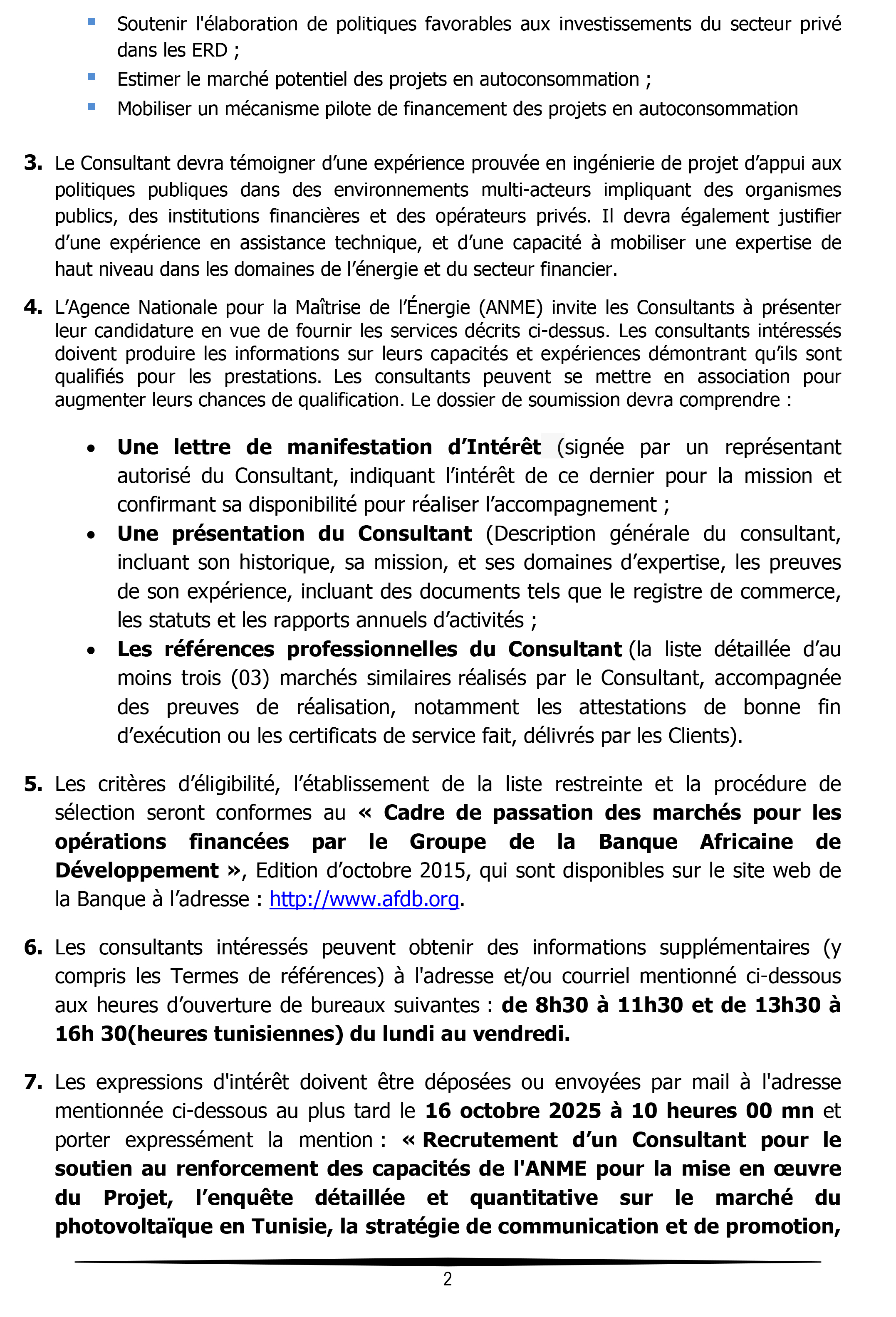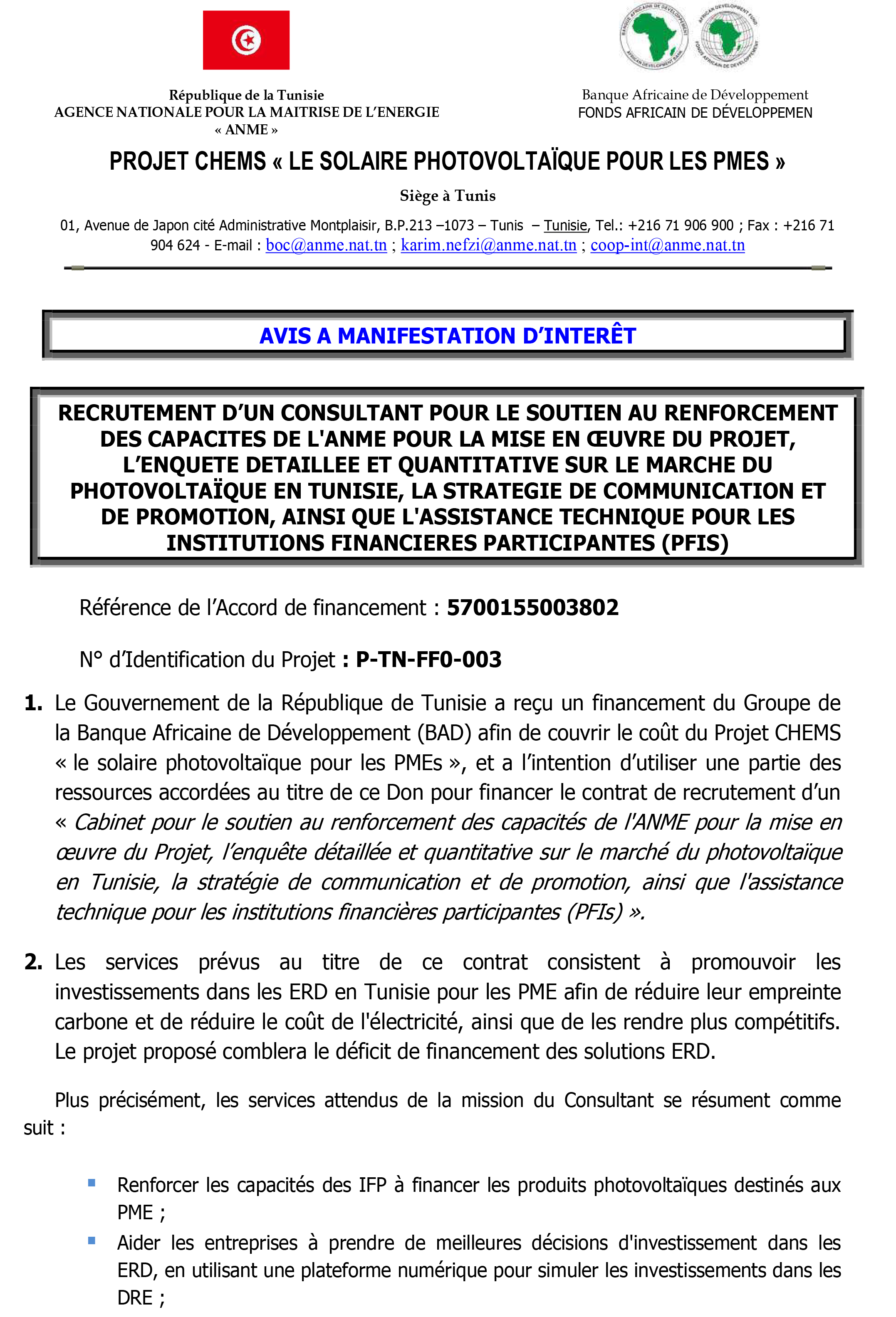 Avis: RECRUTEMENT D’UN CONSULTANT POUR LE SOUTIEN AU RENFORCEMENT DES CAPACITES DE L'ANME