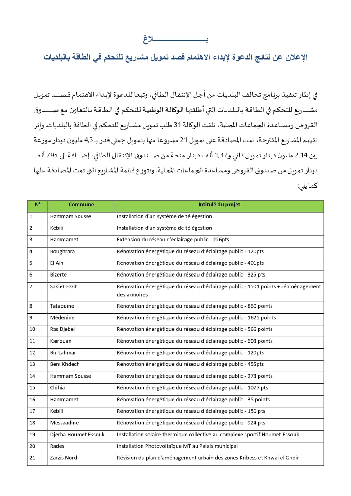 Avis : Annonce des résultats de l'appel à manifestation d'intérêt pour le financement de projets de maîtrise de l'énergie dans les communes
